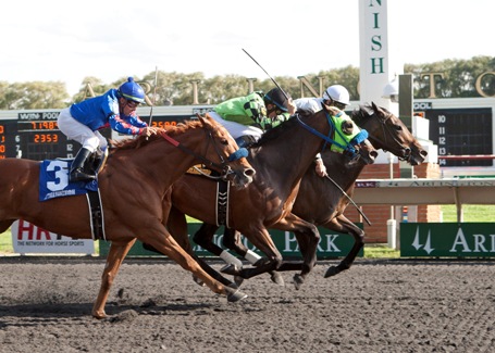 Seven weeks after narrowly missing a wire-to-wire score in the 1 1/4-mile Arlington Handicap, Avanzare found the cutback to nine furlongs agreeable in Saturday's Grade 3, $150,000 Despite setting pokey fractions of :24 4/5, :50 and 1:15 3/5, Avanzare was unable to separate himself for long in the run to the wire, coming under a serious challenge from 24-1 longshot Hattaash inside the final furlong. Digging deep in the final yards, Avanzare turned back that rival to win by a head in a time of 1:52 3/5. A 3-1 chance, who returned $8.60, Avanzare was guided by Chris Emigh, who was registering his 3,500th career victory. "I thought (Gimmeadrink) would should more gas and that would have scared me, if we hooked up and killed each other," Emigh said. "I got the jump on him into the turn and slowed it down. Everything turned out perfect. We barely hung on and I'm very happy." |