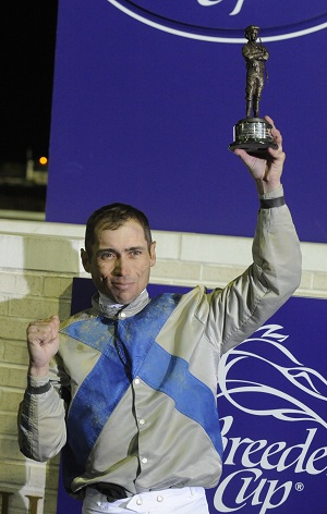 | Garrett Gomez hoisting his fourth Bill Shoemaker Award as the top Breeders' Cup jockey