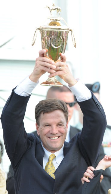 A beaming Graham Motion holds aloft the Derby trophy following Animal Kingdom's victory (Jim Tyrrell/Horsephotos.com)