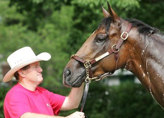 Hard Spun, with trainer Larry Jones, settling in at Belmont (Debra Kral/Horsephotos.com)