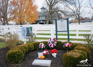 Fans gathered at the Kentucky Horse Park Friday to pay tribute to Hall of Famer Cigar, who died October 7 at the age of 24. The two-time Horse of the Year, and erstwhile richest North American Thoroughbred, was honored in a memorial service highlighted by remarks from his caretakers. Cigar's grave lies just outside the Horse Park's "Hall of Champions," where he had spent his days since 1999. A banner, emblazoned with the words "Remembering Cigar: 1990-2014," and featuring a pair of photos of the legend in his prime and in retirement, festooned the Hall's entrance. Another banner was displayed on the fence by his resting place. Surrounded by shrubs in the shape of a horseshoe, his grave is marked by a stone, and the floral arrangements left by his devoted fans. The feeling was mutual, according to Robin Bush, a groom at the Hall. "Cigar loved being around people, especially people who loved him," Bush said. "Cigar defined greatness for a generation," said Wes Lanter, the Hall's barn manager. |
