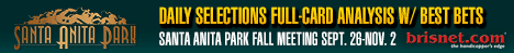 Data provided or compiled by Equibase Company, which includes data from The Jockey Club, generally is accurate but occasionally errors and omissions occur as a result of incorrect data received by others, mistakes in processing and other causes. Equibase Company and Bloodstock Research Information Services, Inc. and Thoroughbred Sports Network disclaim responsibility for the consequences, if any, of such errors, but would appreciate being called to their attention.