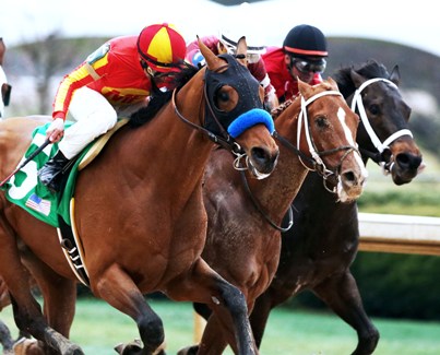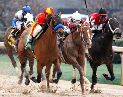 | Hoppertunity (outside) got the best of Tapiture (center) and Ride on Curlin (inside) while Strong Mandate (blue cap) was squeezed back in fourth