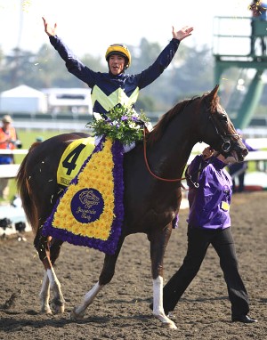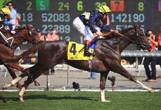 "When I got the split, it took a little while to get in top gear, but it was always going to get there in the end," the winning rider noted. "So it was a very straightforward trip. But it always happens when you go to a horse that can help you, and he did really help me." Pounced, who was coming off a runner-up effort in the Prix Jean-Luc Lagardere (Grand Criterium) (Fr-G1) in his stakes debut, enjoyed an ideal stalking trip. Tucked along the fence for most of the way, the flashy chestnut traveled well within himself, just behind Bridgetown through splits of :23 3/5, :48 2/5 and 1:12 2/5. The top American hope, Interactif (Broken Vow), pressed the pace on the outside and loomed as a threat turning for home. Meanwhile, Dettori was biding his time on Pounced, waiting for a seam to open up between Bridgetown and Interactif. As soon as a sliver of daylight between the two appeared, he sent Pounced through it, and the colt gamely plowed right through to challenge. In a scene reminiscent of Friday's Juvenile Fillies Turf, when the stalking Tapitsfly (Tapit) reeled in pacesetter Rose Catherine (Speightstown), Pounced overtook Bridgetown in deep stretch and was well on top at the wire. After completing the mile in 1:35 2/5 on firm turf, Pounced returned $6.80, $4.80 and $3.20. The 8-1 Bridgetown yielded $6.60 and $4.20 for his brave runner-up effort. Interactif , the 3-1 second choice, missed second by a head and paid $3.20 for his wide-trip third. English invader Awesome Act (Awesome Again), a nearly 32-1 longshot, outperformed his odds with a strong late run for fourth. The $1 exotics were worth $31 (exacta), $90.60 (trifecta) and $2,750.70 (4-7-11-6 superfecta).