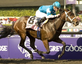While Head compared Goldikova favorably to Miesque last season, the parallel would not have worked for their earlier careers. Miesque was a French champion two-year-old in 1986 with a couple of Group 1 wins already on her resume; Goldikova was two-for-two in minor events as a juvenile in 2007. Miesque was a dual classic winner at three in 1987; Goldikova had the misfortune to be foaled the same year as Zarkava, and finished second to that unbeaten dynamo in the 2008 Poule d'Essai des Pouliches (French One Thousand Guineas) (Fr-G1). Miesque and Goldikova began to resemble each other more closely in the remainder of their sophomore campaigns. Both failed to stay the 10 1/2 furlongs of the Prix de Diane (French Oaks) (Fr-G1). Miesque had finished second, Goldikova third, with the beaten margin being about four lengths in each case. The pair then regrouped back at a mile. Miesque won three of her next four, including the Prix du Moulin de Longchamp (Fr-G1) and Breeders' Cup Mile. Goldikova never lost again in 2008. In addition to capturing a couple of races Miesque hadn't contested in her day -- the Prix Chloe (Fr-G3) and Prix Rothschild (Fr-G1) -- Goldikova emulated Miesque by taking both the Moulin and Breeders' Cup Mile. Unlike Miesque, whose first Mile crown came with an Eclipse Award in 1987, Goldikova was passed over for that honor last year, finishing second in the voting to Filly & Mare Turf queen Forever Together (Belong to Me). Goldikova's 2009 campaign had similarities with Miesque's in 1988. Both kicked off their four-year-old season in the Prix d'Ispahan (Fr-G1), with wildly divergent results. Miesque overcame trouble to get up late by a neck, but Goldikova faded tamely to post the worst effort of her career in seventh. Although the soft ground was initially cited as a factor, Head's yard was also battling a bug early in the year. Whatever the cause for that debacle, Goldikova never ran a bad race in five subsequent starts. Goldikova was ready to rebound in the Falmouth S. (Eng-G1) at Newmarket, where she comfortably defeated Heaven Sent by a measured half-length. Back at home in France, she looked even more authoritative when rolling to a 1 1/2-length score in the Rothschild at Deauville. After cruising in the slipstream of her pacemaker, Goldikova simply skipped clear and was eased late, allowing a game Elusive Wave (Elusive City) to narrow a gap that could have been larger. The paths of Goldikova and Miesque, who had been idle since the d'Ispahan, now resumed their parallel track. Each defeated males in the Prix Jacques le Marois (Fr-G1) in their next start, but Goldikova trumped Miesque in both the time and manner of victory at Deauville. Bursting away in devastating fashion, Goldikova demolished a strong cast by six lengths in a stakes-record 1:33 2/5. As an indicator of her sheer dominance, the runner-up Aqlaam was himself five lengths clear of third. Ironically, the two superstar fillies then suffered narrow upsets at Longchamp. Miesque failed by a head in the Moulin, while Goldikova was nabbed by a half-length when shortening up to about seven furlongs in the Prix de la Foret (Fr-G1). Considering that Goldikova chased a frantic pace, sauntered to the lead, and just tired late to open the door to Varenar (Rock of Gibraltar [Ire]) and Sweet Hearth (Touch Gold), it was a solid enough prep. Like Miesque, Goldikova bounced back to defend her title in the Breeders' Cup Mile. Miesque spread-eagled the field by four lengths at Churchill Downs, but Goldikova had to work for her half-length decision. Disadvantaged by drawing post 11 at Santa Anita, Goldikova was eased back much farther off the pace than usual, yet still delivered her potent kick to reel in Courageous Cat (Storm Cat). Goldikova's 2009 record stood at 6-4-0-1, $1,992,375. Her overall mark reads 15-10-2-2 with earnings of $4,090,090. The Irish-bred filly was produced by the winning Blushing Groom (Fr) mare Born Gold, who is also responsible for Group 3 scorers Gold Round (Caerleon) and Gold Sound (Fr) (Green Tune), the Group 3-placed pair of Born Something (Ire) (Caerleon) and Red Tune (Green Tune), and Ocean Seven (Green Tune), the impressive winner of his lone start at two in 2009. Born Gold is a full sister to multiple Group 1 heroine Gold Splash. Goldikova's second dam is Group 1 queen Riviere d'Or (Lyphard), and her third dam is champion Gold River (Fr) (Riverman), who captured the 1981 Prix de l'Arc de Triomphe (Fr-G1). Goldikova will return to the racecourse as a five-year-old in 2010. Venturing into territory unknown to Miesque, who retired after her four-year-old season, Goldikova will aim for an unprecedented third victory in the Breeders' Cup Mile.