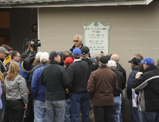 climbed atop an overturned blue plastic feed tub so he could be seen and heard