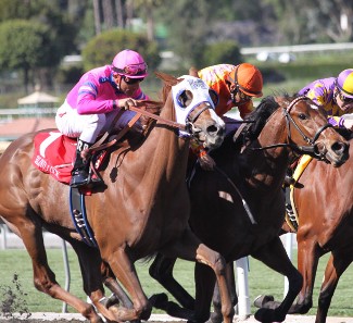 | Blind Luck (left) just got up to deny Evening Jewel in the Las Virgenes