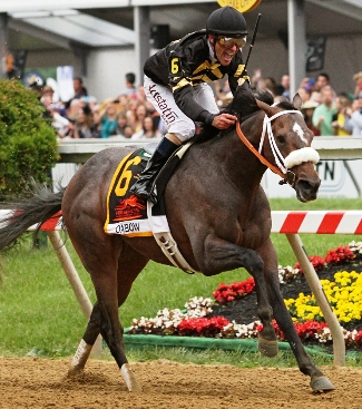 Oxbow, shown winning the Preakness under a jubilant Gary Stevens, was the most reliable performer of the 2013 Triple Crown (Jessie Holmes/EquiSport Photos)