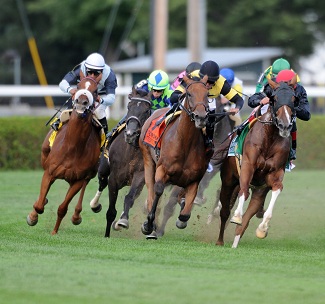 Rounding the final turn, Twilight Eclipse engaged Imagining, and Main Sequence (far left) had work to do (NYRA/Adam Coglianese Photography)