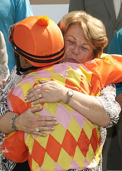 Hall of Fame rider Mike Smith gets a hug from owner Marilyn Braly, who named the colt for her late husband (Benoit Photos)