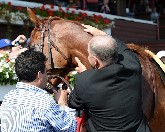 Trainer Charlie LoPresti greets the conquering hero (NYRA/Adam Coglianese Photography)