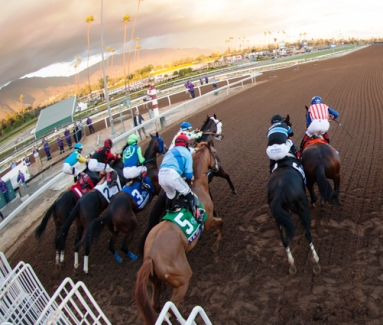 A view from the starting gate as Bayern (red, white and blue silks) veers left into Shared Belief (Wendy Wooley/EquiSport Photos)