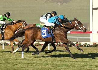 Sent postward as 7-2 third choice among 10 rivals, the five-year-old son of Powerscourt completed 1 1/2 miles on the firm grass in 2:27 1/5. The Hollywood Turf Cup marked the first 1 1/2-mile race over the Jimmy Durante Turf Course in Del Mar's history.