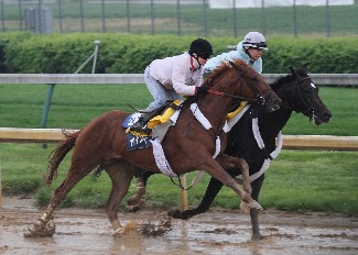 With eyes on the dark sky and a weather forecast that called for additional rain and storms on Saturday, trainer Mike Maker moved the pre-race works for his Kentucky Derby duo of Blue Grass upsetter STATELY VICTOR (Ghostzapper) and Lane's End S. (G2) winner DEAN'S KITTEN (Kitten's Joy) up a day. He sent both horses to the sloppy track at Trackside Louisville training center in the company of workmates. Stately Victor, who crashed the Kentucky Derby picture with a shocking 40-1 victory in the Blue Grass, worked over the six-furlong oval just after the mid-session break for track maintenance. Under Marvin Jimenez, Stately Victor blitzed five furlongs in a bullet 1:00 3/5, tying for the fastest of 13 moves at the distance. Working in company with the three-year-old Kera's Kitten (Kitten's Joy), Stately Victor covered the distance in fractions of :11, :22 2/5, :34 3/5, :and :47 1/5 and galloped out six furlongs in 1:16 3/5. Multiple stakes victor Kera's Kitten, a distant fifth in the Hansel S., was ridden by Derrick Scott and was timed in 1:00 4/5 for five furlongs. The move by Stately Victor was his first serious training move since his breakthrough victory over a synthetic Polytrack surface in the Blue Grass and only significant move prior to the May 1 Kentucky Derby. "I was looking for what we got," Maker said. "He did it well within himself and galloped out strong as usual. So it's status quo. He hasn't lost an ounce of weight and to me looks to me as beautiful as he was going into the Blue Grass, so hopefully his synthetic track (form) will transfer over the to the dirt." For the second consecutive week, Dean's Kitten worked in company with the stakes-winning three-year-old filly Age of Humor (Distorted Humor), Maker's candidate for the Kentucky Oaks. The pair worked as a team into the stretch and Age of Humor, wearing Ramsey Farm blinkers and ridden by Scott, edged ahead in upper stretch. But Dean's Kitten, with Jiminez up, rallied and the two finished together in 1:01 1/5. The duo covered the distance in fractional times of :11 1/5, :22 3/5, :35 3/5 and :47 4/5. Age of Humor finished the six-furlong gallop-out about a length in front of Dean's Kitten. Maker was just as happy with the work by Dean's Kitten, who was pushed along by Age of Humor, an improving filly who appears unlikely to draw in to the 14-horse Kentucky Oaks field because of insufficient earnings in graded stakes races. "It was a similar-type work and the results were about the same as last week," he said. "Dean's Kitten is not an impressive work horse, so he's status quo as well." Maker's Kentucky Derby duo must ship to Churchill Downs from Trackside Louisville by Thursday of Derby Week. He would have preferred to keep the horses at Trackside until Derby morning, but the move is not a significant factor in his mind. "I'd like to, but they'll get a trip around the track, school in the (starting) gate and the paddock and we'll lead 'em over there," he said. In other Kentucky Derby news: Illinois Derby (G3) hero AMERICAN LION (Tiznow) galloped after the renovation break over a sloppy track at Churchill Downs with exercise rider Paul Turner up. The Eoin Harty trainee is scheduled to work Monday. Gotham S.(G3) star AWESOME ACT (Awesome Again) returned to the track two days after working six furlongs in 1:12 3/5 for an easy gallop with assistant trainer Wayne Tanner up. Third after a less than ideal trip in the Wood Memorial last out, the Jeremy Noseda pupil is slated to work Tuesday. Sanford S. (G2) victor BACKTALK (Smarty Jones), third in the Illinois Derby, galloped over a wet-fast track early Friday morning with Maurice Sanchez aboard. Trainer Tom Amoss has scheduled a Sunday work for Backtalk, but with more rain in the Louisville, Kentucky, forecast the next two days, Amoss is toying with the idea of taking Backtalk to Keeneland to work over the Polytrack surface. Trainer Bob Baffert had his two hopefuls for Kentucky Derby 136 gallop after the renovation break over a sloppy track. Dana Barnes was aboard champion LOOKIN AT LUCKY (Smart Strike), a badly-troubled third in the Santa Anita Derby (G1), and Peter Hutton was on dual Grade 3 scorer CONVEYANCE (Indian Charlie), who is coming off a runner-up effort in the Sunland Derby (G3). The two colts are scheduled for their final pre-Derby works on Monday. Louisiana Derby (G2) winner MISSION IMPAZIBLE (Unbridled's Song) was the first of trainer Todd Pletcher's Kentucky Derby hopefuls to go to the track Friday, galloping 1 1/4 miles under Kevin Willey over a track labeled as wet-fast.