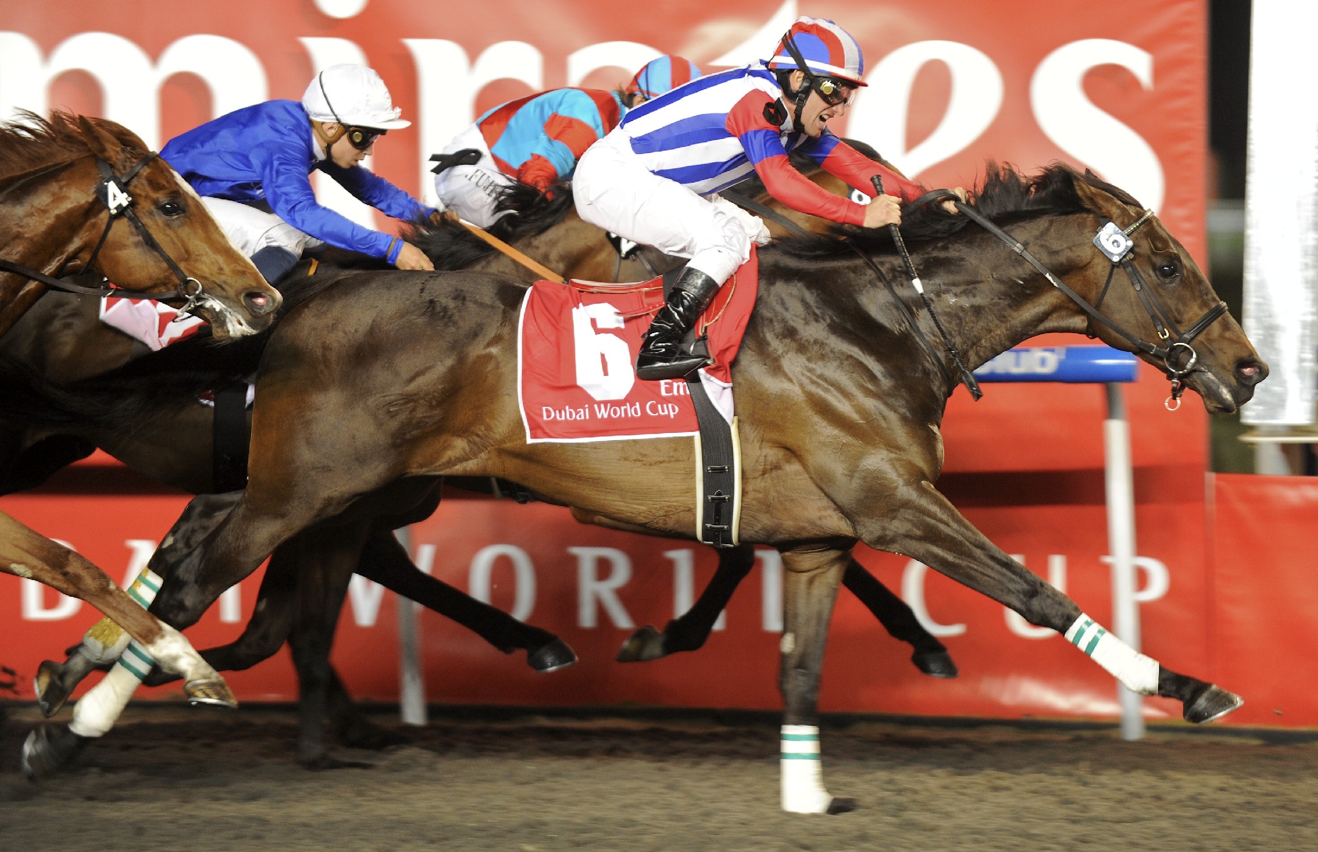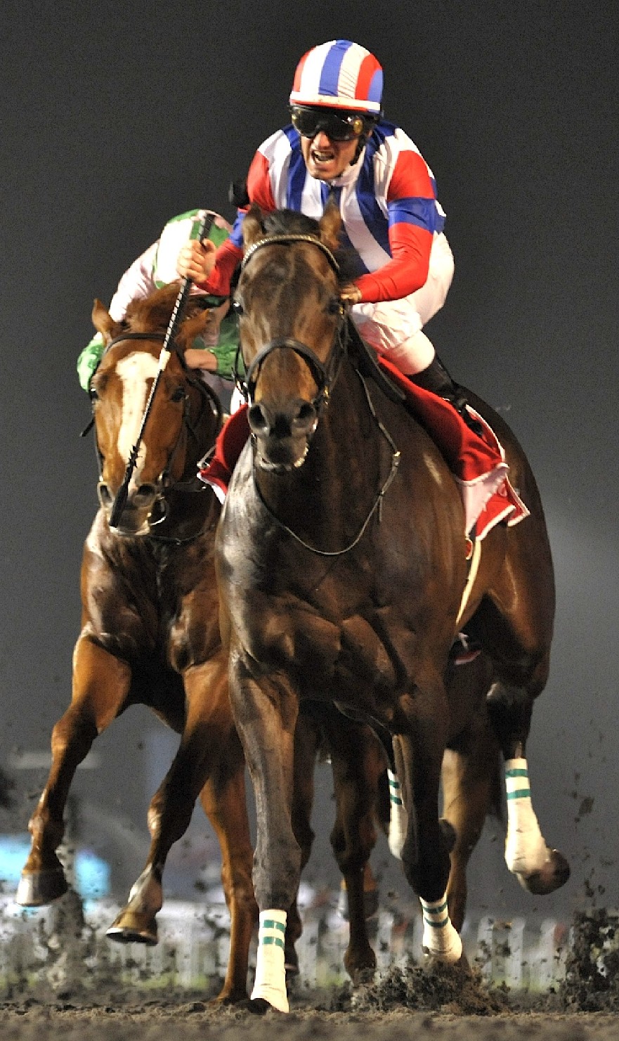 Owned by Yoshimi Ichikawa and trained by Katsuhiko Sumii, Victoire Pisa had previously earned his biggest victories at Nakayama. Over that right-handed course, he captured the 2010 Satsuki Sho (Japanese Two Thousand Guineas) (Jpn-G1) and Arima Kinen (Jpn-G1), defeating Japanese Horse of the Year and World Cup rival Buena Vista (Special Week) in the latter, and he opened 2011 with a comprehensive success in the February 27 Nakayama Kinen (Jpn-G2). But Victoire Pisa had failed to shine in his previous foreign mission to France last campaign, and he was also attempting a synthetic surface for the first time here. Answering any lingering question marks with a resounding affirmative, the four-year-old presented Japan with its first World Cup trophy. The confirmed front runner Transcend quickly took up his position at the head of affairs, stalked by Coolmore's Cape Blanco (Galileo [Ire]), and Godolphin's Monterosso (Dubawi) tracked them in a ground-saving spot. A fracas ensued farther back in the field on the first turn, as Fly Down (Mineshaft) was checked hard on the fence, and several others were jostled around.