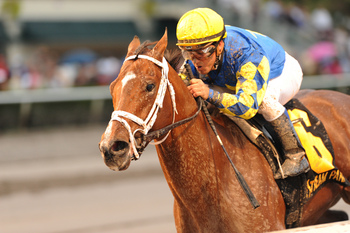 Pedigree pundits might have noted that Algorithms had a bit of family history going for him. He is a half-brother to four stakes winners, including Keyed Entry, who prevailed in the Grade 2 Hutcheson in 2006 in similar conditions for Starlight Stable and partners. That day, he upset multiple Grade 1 winner First Samurai, one of the previous year's top juveniles, also in the Gulfstream slop. Like Keyed Entry, Algorithms was unbeaten going into his stakes debut, and stole the spotlight from a more accomplished rival. Most recently successful in an allowance/optional claimer at Gulfstream, the Bernardini colt was dispatched as the 5-2 second choice. Hansen, who was last seen clinching the Eclipse Award with a hard-fought victory in the Breeders' Cup Juvenile, was the 4-5 favorite. But the champion's first step on the Derby trail literally went amiss. Hansen stumbled right out of the gate, lurched left when trying to regain his balance, and appeared to crowd into My Adonis. Quickly righting himself, Hansen turned on his trademark speed and sprinted to the fore. The gray was three lengths clear through an opening quarter in :23 3/5, and he widened his margin to 4 1/2 lengths when reaching the half-mile mark in :45 3/5. Meanwhile, Algorithms was cruising in tandem with Silver Max, and was arguably traveling better than Hansen rounding the far turn. Hansen's lead gradually diminished through six furlongs in 1:10 1/5, and he came under pressure from Ramon Dominguez entering the stretch. Algorithms, in contrast, was just beginning to hit his stride. Overwhelming Hansen in a few strides, Algorithms put the race away and skipped clear in a final time of 1:36 for the one-turn mile. The resounding winner paid $7, $2.80 and $2.40. "I wanted to take my time and not rush my horse," Castellano said. "Hansen has a lot of speed and he's the two-year-old champion, so I was just really patient and waited for the right time to move. He felt absolutely amazing today. He broke so sharp and wanted to go to the lead, but I just took my time."