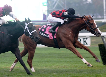 Testa Rossi gave Brown a sweep of the two juvenile turf stakes at Big Sandy on Sunday, just one race after Bobby's Kitten took the Pilgrim for owner/breeder Ken and Sarah Ramsey with Javier Castellano aboard. Brown's other entrant in the Miss Grillo, 9-5 favorite Granny Mc's Kitten, finished fourth. "You never know until you run them," Brown stated. "Her works were good -- they weren't great -- but you know what? She's a good-looking horse, she's got good form and every week she seems to be improving. The idea was to go ahead and enter her, knowing she's on the improve. "I wasn't concerned about the extra distance (stretching out from seven furlongs). I have a bunch of these fillies and I picked the two I thought would give me the best chance to win, and she was one of them." As for fourth-placer Granny Mc's Kitten, Brown added, "Granny Mc's Kitten missed her last work. She had a great two days of training this week. In hindsight it might have compromised her a bit. If she has the credentials to get into the Breeders' Cup I sure would like to take her. Maybe she'll have smoother training going into that race." The conditioner didn't mention whether Testa Rossi would utilize her automatic berth in the Breeders' Cup Juvenile Fillies Turf that came via the Miss Grillo being a "Win and You're In" race. Sky Painter was four lengths up on stablemate Dancing House when hitting the wire, with the latter holding Granny Mc's Kitten to fourth by a half-length. "It was a tough beat," admitted Kiaran McLaughlin, who trains both Sky Painter and Dancing House. "Both of them ran very well. We're pleased with both. We were unlucky to lose a tough photo, but congratulations to the winning team. We'll talk about the Breeders' Cup Juvenile Fillies Turf." Duff One, Morethanawarning, Echale Salsita, Miss Frost, Bikini Beauty, Selenite and Sea Bubble completed the order under the wire. Bred in France by Barbara Moser, Testa Rossi is out of the winning Dancing Spree mare Peggy Lane. The chestnut filly just missed in her April 28 racing bow at Lyon in France, then finished fifth by only a length over that same heavy course on May 10. She broke her maiden on June 2 at Lyon and has been unbeaten in all three starts since, including her French finale at Maisons-Laffitte on July 7. Testa Rossi has racked up $175,422 in career earnings and her line now stands at 6-4-1-0. Bet Horseracing Free Online at TwinSpires.com