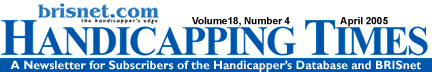 Are You the Best? PROVE IT!Now in its 7th year, the $30,000 Brisnet.com Online Handicapping Challenge returns the weekends of April 9 - 23. It's three separate contests with three opportunities to qualify for the 2006 National Handicapping Championship in Las Vegas. There are 10 mandatory races each Saturday (April 9, 16, 23), and winning is based on a hypothetical $2 win/place wager on each selection with caps of 25-1 (Win) and 12-1 (Place) respectively. "The Granddaddy of Internet tournaments..." - The HorsePlayer magazine Brisnet.com Online Handicapping Challenge The three winners will each secure a spot to clash for the coveted title of Handicapper of the Year next January at Bally's in Las Vegas. Brisnet.com is picking up the tab for airfare, NTRA fees and hotel accommodations, a $2,500 value each! As always, it's FREE to play from the comfort of home! Earn the highest return based on hypothetical $2 win and place wagers and you'll be heading to Las Vegas with cash to boot. Sign up closes Saturday, April 9 by 1:59 PM ET, but don't delay. You only need to register once to participate in all three events of the Challenge. Don't delay. Visit Brisnet.com/challenge for contest details, rules, and free registration. Customized contest cards, featuring all mandatory races in one download, will be available each Thursday evening. A special contest analysis from the Wizard will also be offered online. * A Brisnet free membership and computer with Internet access required to participate. One free entry per member. All contestants must register to play in these events regardless of participation in years' past. |