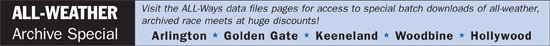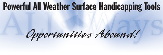 About ALL-Ways Powerful All Weather Surface Handicapping Information: ALL-Ways software includes the all weather surface handicapping information you would expect including extensive track bias statistics, each horse's all weather surface performance statistics and all weather surface ("AWS") speed figures including AWS BRIS Speed 2/3, Best AWS BRIS Speed and Best AWS BRIS Speed at Today's Track. And, there is a whole lot more all weather surface handicapping help in ALL-Ways. Read on! Hall Pace and Speed Figures: In addition to BRIS pace and speed figures, ALL-Ways includes the powerful Hall figures as well. They make use of the concept of "conservation of energy" to adjust each horse's past performance races to estimate how the horse's performance would have been at today's specific distance, specific surface and specific track. This "normalization" approach has proven to be extremely powerful for the new all weather surface tracks. ALL-Ways Automatic Pace Line Selection: ALL-Ways automatically selects pace line races for evaluating each horse's pace and speed figures with special considerations given to past all weather surface races. BRIS and Hall Compound Pace and Speed Figures: These ratings are: Combined Rating (Early Pace plus Final Fraction), Total Rating (Early Pace plus Speed) and Late Rating (Final Fraction plus Speed). The Gap analyses for these Compound Ratings, at virtually every all weather surface track in North America, frequently point to solid profitable return-on-investment plays. Race Track and Race Type Specific Handicapping Profiles: ALL-Ways automatically creates custom handicapping profiles specifically for each individual race on the race card. Testing shows these profiles have been particularly effective for profitably handicapping all weather surface races. Search Handicapping Report: This special handicapping report is particularly powerful for playing all weather surface races. It includes extensive track bias information, it identifies horses with strong Gap advantage(s), it identifies good Key-Horse candidates, it uses the Compound Ratings discussed above to identify the best early running and the best late running horses (particularly powerful for multi-horse wagers) and it shows the selections made by ALL-Ways Handicapping Profiles. It also identifies horses qualifying for your own personal handicapping angles (Custom Search Definitions). Take Action: ALL-Ways software is free. You can call BRIS at 1 800 354 9206 and have the software and User Manual, pre-printed in a 3-ring binder, mailed to you for a nominal S&H charge. You can also download ALL-Ways software and the ALL-Ways User Manual from the BRIS Web site. You can also learn more about ALL-Ways software by visiting the ALL-Ways Free Software Page on the BRIS Web site. This includes more information about how ALL-Ways works and about how best to get started with ALL-Ways to get on your way towards "cracking the code" of all weather surface handicapping. You just might become an expert at it!