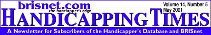 Brisnet.com Online Handicapping Challenge 2001Now in its 3rd year, the $25,000 Brisnet.com Online Handicapping Challenge is your opportunity to play from home FREE, win big cash prizes, and book your own ticket to Las Vegas for the $200,000 National Handicapping Championship in January 2002. The Challenge begins June 2 so register now! New for 2001 is a rules change that lets you win one of two ways. As always, if you select the most winners over the four Saturdays (June 2-23) you win $10,000 cash and the free trip to Vegas. But this year, if you have the highest Return on Investment (highest bankroll based on a $2 win wager) over the four Saturdays, you will also be heading to Las Vegas with a free berth in the big tournament. Plus, their will be prizes to the overall top ten players in each category - most winners and highest ROI. This new enhancement and opportunity to qualify was based on customer feedback after last year's Challenge! Two Ways Win!