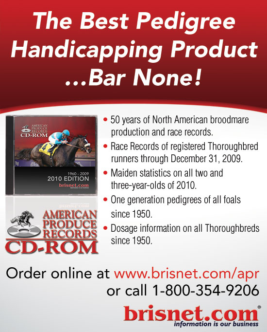 Which trainer wins with 43% of his runners dropping 2 or more levels in class and does so at a flat-bet profit at Hollywood Park? FIND OUT on page 16 of SO. CALIFORNIA TRACK STATS 2010! What is the most speed favoring distance over the synthetic track at Hollywood Park? The answer may surprise you. FIND OUT on page 62! What major circuit produced only 6% winners with shippers into Churchill Downs last year? You won't believe it! FIND OUT on page 100 of KENTUCKY TRACK STATS 2010! Which trainer has won with 17% of his first time starters but 40% of his second time starters at Churchill Downs over the past three seasons? FIND OUT on page 15! Which trainer has won 86% of the time with 1st time Lasix runners at Woodbine? FIND OUT on page 33 of the CANADIAN TRACK STATS book! Find out all the answers with the one and only TRACK STATS 2010 from Bloodstock Research. With detailed trainer stats on all horseman separated by track, plus a wealth of other track-specific data, TRACK STATS 2010 is the handicapping guide you need to win at the races this year. Each edition is loaded with golden nuggets of information! It is available for 12 different circuits, including all the major tracks running or opening soon. Take advantage of this special offer: if you order 3 or more editions of Track Stats, we will send you SIRE STATS 2010 absolutely FREE. A $45 value, Sire Stats offers all weather, turf, mud, debut and distance ratings on over 4,700 stallions! For more information and to order online, visit: www.brisnet.com/bookstore or, call 1-800-354-9206, ext. 7+254. Only $27.95 for each jam-packed edition (plus only one s/h charge)! Increase your handicapping knowledge on any circuit you wish by ordering Track Stats 2010. Available for 12 circuits, including Kentucky, So. Calfornia, New Jersey, and New York, Track Stats has the track-specific data you need on Trainers, Jockeys, Horses, Biases, Shippers, and more. Order today!