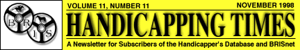 The Standard in Europe TIMEFORM is Europe's premiere handicapping service, rating and evaluating horses for nearly 50 years. Their "race cards" are a must for British horseplayers and through an arrangement with BRIS, Timeform will once again produce a special Breeders' Cup 1998 edition. This invaluable report offers the best and most accurate comparisons possible between the stars from both sides of the Atlantic. Detailed comments and ratings are provided for every horse on the card. Timeform has been reviewing and rating all North American Graded Stakes races for five years, so their team of handicappers are in a unique position to offer analysis on both the European and North American challengers. So this year, find out what the leading European handicapping service thinks about their Breeders' Cup chances, as well as getting a whole new perspective on the home team. The Timeform Breeders' Cup Race Card will be available online the evening of Wednesday, November 4. At \$10, it could be the wisest investment you make for Breeders' Cup XV. LET US DO THE WORK FOR YOU! PRO Picks BRIS also offers several other perspectives for Breeders' Cup Day. No Breeders' Cup would be complete without the WIZARD'S insight into the big day. For only \$15.00 the Wizard provides his detailed analysis and wagering strategies for each of the seven races. He's been following the horses for months, and the work shows in this comprehensive report. The SCRATCH SHEET is the ultimate in convenience, providing expert picks, morning line odds/program numbers, weather forecasts, speed and class ratings, and track bias profiles all on one page per track. Available in ready-to-print PDF format, the Scratch Sheet is easy to print and a true bargain for only \$1.00. The KENTUCKY HANDICAPPER'S SHEET (\$3) is produced in-house at BRIS and offers a professional handicapper's view into the Breeders' Cup card as well as all the races on the undercard at Churchill Downs. Why Pay for Handicapping Software Save time and take advantage of the best handicapping software on the market today. Eight different programs are available -- ALLWays, AOdds, Capsheet, Common Ground Online, MultiCaps, Neurax, Pacemaker, and PlusV -- exclusively for BRIS customers. Download any or all of these programs at absolutely no charge!
