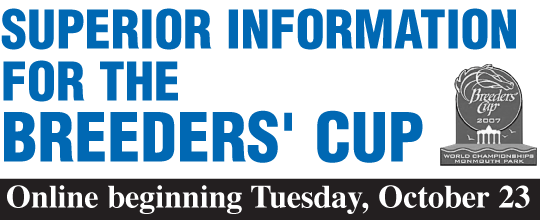 October/November, 2007 VOL. 21, NO. 8 SEE INSIDE THIS MONTH'S ISSUE FOR... >> Superior Information for the Breeders' Cup It's hard to believe it has been 25 years since leading owner and breeder John R. Gaines announced the formation of a championship day for racing that would be entitled the Breeders' Cup. Now known as the Breeders' Cup World Thoroughbred Championships, racing's grand event has moved around to several locations, but this year it will be contested for the first time at beautiful Monmouth Park near the Jersey shore. Also for the time, the Cup expands to two days of racing with the addition of three new million dollar events. Races have now been added to accommodate filly sprinters, two-year-old turf runners, and dirt milers. The three new races will be contested on Friday, October 26 with the traditional eight races carded the following day. Both days of racing will be drawn on Tuesday, giving handicappers extra time to dissect Saturday's full card. Once again Brisnet.com is here to help! We believe that the analysis and statistics offered through our service provide users with a significant wagering advantage. On no day is this more evident than on the Breeders' Cup. WHAT ARE THE CONNECTIONS SAYING? The FREE Handicapper's Edge Newsletter offers updated daily news on all the Cup happenings. Read it every day and you'll know all the recent updates prior to the big raceday. The Edge includes some top-notch handicapping articles and in-depth analysis of each race. EUROPEAN INSIGHT - Want to know what the Europeans think of their chances? Not only will you get the famous Timeform ratings on all runners, you will gain valuable insight into all the horses from both sides of the Atlantic. This is the best report for getting the European perspective. Online by Thursday of Breeders' Cup week. CLOCKER REPORT Our exclusive professional clocker service, Handicapper's Report, is something few horseplayers will have their hands on. Find out how many of the contenders have been training, both positively or negatively. Coverage of works from New York, Kentucky and California are all rolled into one special report for the Cup. The Fit-n-Ready workers are considered the standouts on the card. Don't attack these two days of racing without the HR Report. THE WIZARD KNOWS MONMOUTH America's premier handicapper, the Wizard, will be on top of these races like no other handicapper. The Wizard closely follows Monmouth Park each year and is tuned in to this track's idiosyncrasies. For a professional's perspective of the Cup, tap into his comprehensive coverage with expert wagering strategies in Saturday's Major Stakes sheet ($15). Other special products for Saturday include the Dime Superfecta play ($5), based on a wager available for the first time at the Cup, and the Pick of the Day ($6). Coverage of the three new Breeders' Cup events will be included in Friday's Monmouth Park daily sheet ($6) at no extra charge! PACE RATINGS & RACE SHAPE With so many quality horses competing on one card, it can be difficult to determine the pace scenario. This is a critical factor, and the BRIS Early and Late Pace Ratings are the key tools for making a correct pre-race analysis. Is a frontrunner simply too slow based on the pace ratings? Does your preferred turf closer have a strong enough late kick? The BRIS Pace Ratings, found in the Premium, Quick Play and Ultimate PPs, can answer all these questions and more. With so many contentious Breeders' Cup preps, you want to know if a runner exited either an exceptionally fast or slow paced race which positively or negatively affected the chances of this particular horse. The new BRIS Race Shapes make it easy to quickly pinpoint runners that were affected by the race setup. The BRIS Race Shapes measure how fast the leader ran relative to the average leader's time for the race's final time/speed rating. The faster the leader's pace, the higher the BRIS Race Shape (e.g. +7). The slower the leader's pace, the lower the BRIS Race Shape (e.g. -7). Use both the BRIS Pace Ratings and Races Shapes to your advantage on Breeders' Cup weekend!