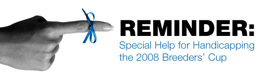 September, 2008 VOL. 22, NO. 8 SEE INSIDE THIS MONTH'S ISSUE FOR... >> Save Time, Paper, & Ink! Take advantage of 3 free, unlimited race dates of Quick Play PPs during the month of September. This limited time offer applies to both versions, the Page Savers and the Full edition. The Quick Play PPs (Page Savers) are designed to do what their name implies - give you all the great, value-added BRIS data in a condensed, page-saving format. Print an entire race card with fewer pages, saving you both paper and ink. A typical 10-race card will only take 20-22 pages, but you won't miss out on any of the valuable BRIS information. The Quick Play� Past Performances provides several features that make handicapping easier and quicker than ever before. Every one needs to save time, and Quick Play PP's is the answer! First, it provides comments, both positive and negative, for each and every horse on the card. Best of all, the comments use value-added BRIS data such as trainer and pedigree stats. Quick Play PPs include Early/Late Pace Ratings, Race Shapes, Prime Power Rating, Jockey/Trainer combo stats for both the meet and year, all weather race records and much more. Analyzing the pros and cons of each runner has never been easier. At the top of each race, summary boxes are listed which provide a quick glance at the top contenders. Using our most predictive BRIS ratings, including Prime Power�, you can easily see which runners are most competitive entering today's event. If you are using the Condensed or Premium PPs from Brisnet.com, it is time to upgrade. Don't miss out on the Quick Play giveaway during the month of September. Access any three race dates of your choice absolutely FREE. Can you be one of the top 50 handicappers on any given Saturday? Of course you can. Play free this month in the September 20 online handicapping tournament limited to Brisnet.com members. Finish in the top 50 and then play FREE from home (in the November finals) for 3 spots to the $1 Million National Handicapping Championship. The top 3 bankrolls based on hypothetical $2 win and place wagers will win their way to Las Vegas. Your odds have never been better! For the Finals, Brisnet.com is picking up the tab for airfare, NTRA fees and hotel accommodations in Vegas at the fabulous Red Rock resort. Take advantage of your Brisnet.com membership and claim your free entry in the 10th annual Brisnet.com Online Handicapping Challenge. Cash prizes and a free entry into the $750,000 Horse Player World Series are given away in each of two remaining satellite events. As always, it's FREE to play from the comfort of your home! Sign-up closes Saturday, Sept. 20 by 1:59 PM ET, but don't delay. After this tournament in September, the final chance of the year is Saturday, October 18. Register once to participate in both events. Sign up FREE now! Visit www.brisnet.com/challenge for contest details, rules, and free registration. Customized contest cards, featuring all mandatory races in one download, will be available Thursday evening before each satellite event. A special contest analysis from the Wizard will also be offered online. Prepare for the Gridiron each weekend with the INSIDER'S EDGE. This exclusive report offers expert selections, injury updates, important trends, ratings, and more on select college and pro games. INSIDER'S EDGE isolates the most favorable matchups on the gridiron each weekend, and even includes recommended plays on Over/unders! $20 - online and updated by Thursday of each week. The 2008 Breeders' Cup will be conducted during the upcoming Oak Tree Meet at Santa Anita. Since the 2007 Oak Tree Meet at Santa Anita, races there have been contested on synthetic track. This means the 2008 Breeders' Cup 'dirt' races will actually be run on an "all weather" surface for the first time in Breeders' Cup history. BRIS and Frandsen Publishing have arranged for two items of special help for you to prepare for the 2008 Breeders' Cup that can be accessed on the ALL-Ways Data File page of the BRIS Web site.