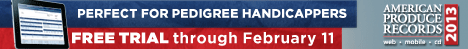 Data provided or compiled by Equibase Company, which includes data from The Jockey Club, generally is accurate but occasionally errors and omissions occur as a result of incorrect data received by others, mistakes in processing and other causes. Equibase Company and Bloodstock Research Information Services, Inc. and Thoroughbred Sports Network disclaim responsibility for the consequences, if any, of such errors, but would appreciate being called to their attention.