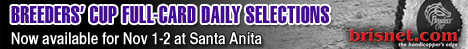 Data provided or compiled by Equibase Company, which includes data from The Jockey Club, generally is accurate but occasionally errors and omissions occur as a result of incorrect data received by others, mistakes in processing and other causes. Equibase Company and Bloodstock Research Information Services, Inc. and Thoroughbred Sports Network disclaim responsibility for the consequences, if any, of such errors, but would appreciate being called to their attention.