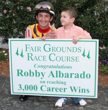 Jockey Robby Albarado scored his 3,000th career victory on Thursday at Fair Grounds with family and friends looking on. He guided fellow Louisiana-bred, ISLE OF SILVER (Autocracy), to a neck win in the 6TH race. The gray two-year-old colt, owned by Valene Farms and trained by Troy Young, completed the six-furlong maiden special weight event in 1:13 2/5 on the good track. Albarado's wife, Kimber, and son Kalen were on hand for the milestone victory, as was his agent, Lenny Pike.