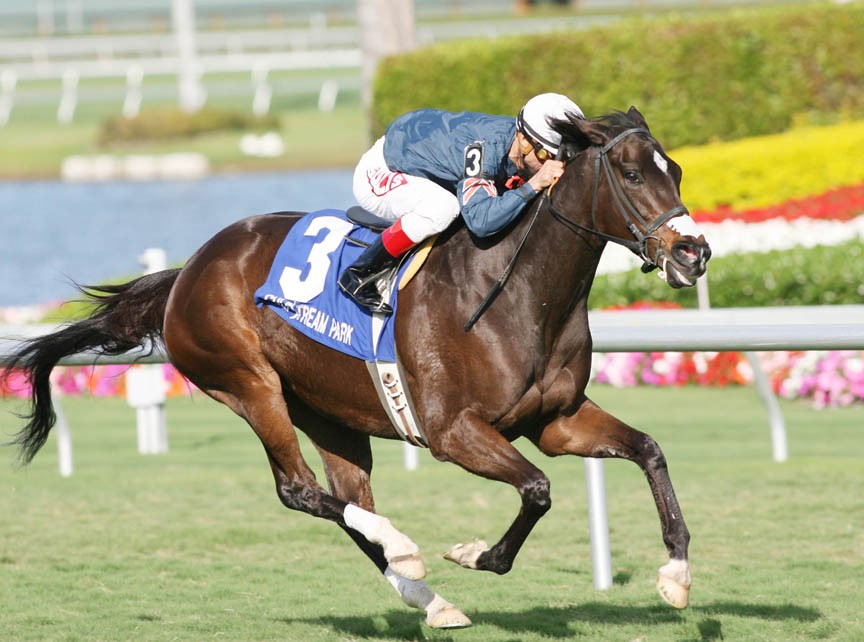 Unplaced in seven prior attempts in graded stakes company, Farnsworth Stables' CHEROKEE QUEEN's (Cherokee Run) persistence finally paid off in Saturday's $150,000 Suwannee River S. (G3) at Gulfstream Park when the six-year-old mare drove home a two-length winner under Alex Solis. Tracking in third behind long-time leader Persuading (Broken Vow) as that rival set splits of :23 4/5, :47 2/5 and 1:10 3/5, Cherokee Queen moved up to engage that filly at the top of the stretch and drew off to complete nine furlongs on a firm turf in 1:46 3/5. The 9-2 third choice, she paid $11, $5.40 and $4. "(Trainer) Marty (Wolfson) told me to try to keep her a little closer to the pace today," Solis said. "I was saving all the ground and just tried to be patient. Around the quarter pole I asked her to go and she did her thing." Never Retreat (Smart Strike), the 3-1 second choice, rallied from near the back to nab second by a half-length over Persuading, who had two lengths up on 5-2 favorite It's Tea Time (Dynaformer).