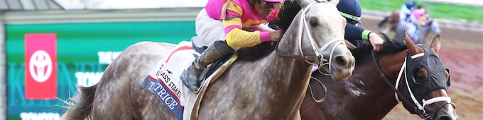 Trikari led a parade of longshots home in the $596,560 American Turf (G2) for three-year-olds at Churchill Downs on Saturday.