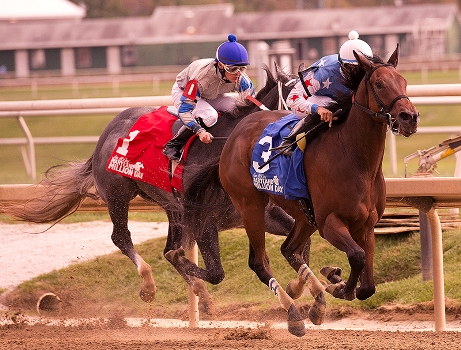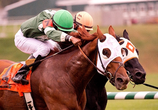 by a neck, with 3-5 favorite Ju Ju Eyeballs 1 1/2 lengths adrift in third.