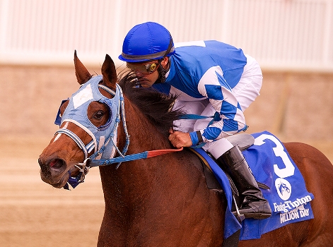 Jonesin for Jerry surged to the lead before halfway and went on to score by a decisive 5 1/2 lengths in the $100,000 Million Lassie for two-year-old fillies. Under Abel Castellano Jr., the John Robb trainee completed six furlongs in 1:11 and paid $3 as the 1-2 favorite. Steady N Love finished a neck ahead of Pocket Gift fort the place. "She was pretty wound up in the paddock and I was pretty worried," Robb said. "I was really worried when she was coming down the backstretch because she doesn't like to be rated. She threw her head up but the jockey did a great job settling her." |