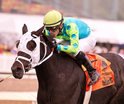 Ribo Bobo rolled to his ninth straight win of the season with a wire-to-wire triumph in the $100,000 Million Sprint and returned $3.80 as the 9-10 favorite. Under Julien Pimentel, the five-year-old set splits of :22 and :44 3/5, and finished up six furlongs in 1:08 3/5. He was 5 3/4 lengths clear of the race's 2012 winner, Action Andy, who was 2 1/4 lengths ahead of Fersmiley in the field of four. "He keeps moving up and winning races so we will take him to Florida. He is amazing," said Carlos David, assistant to trainer Jason Servis. |