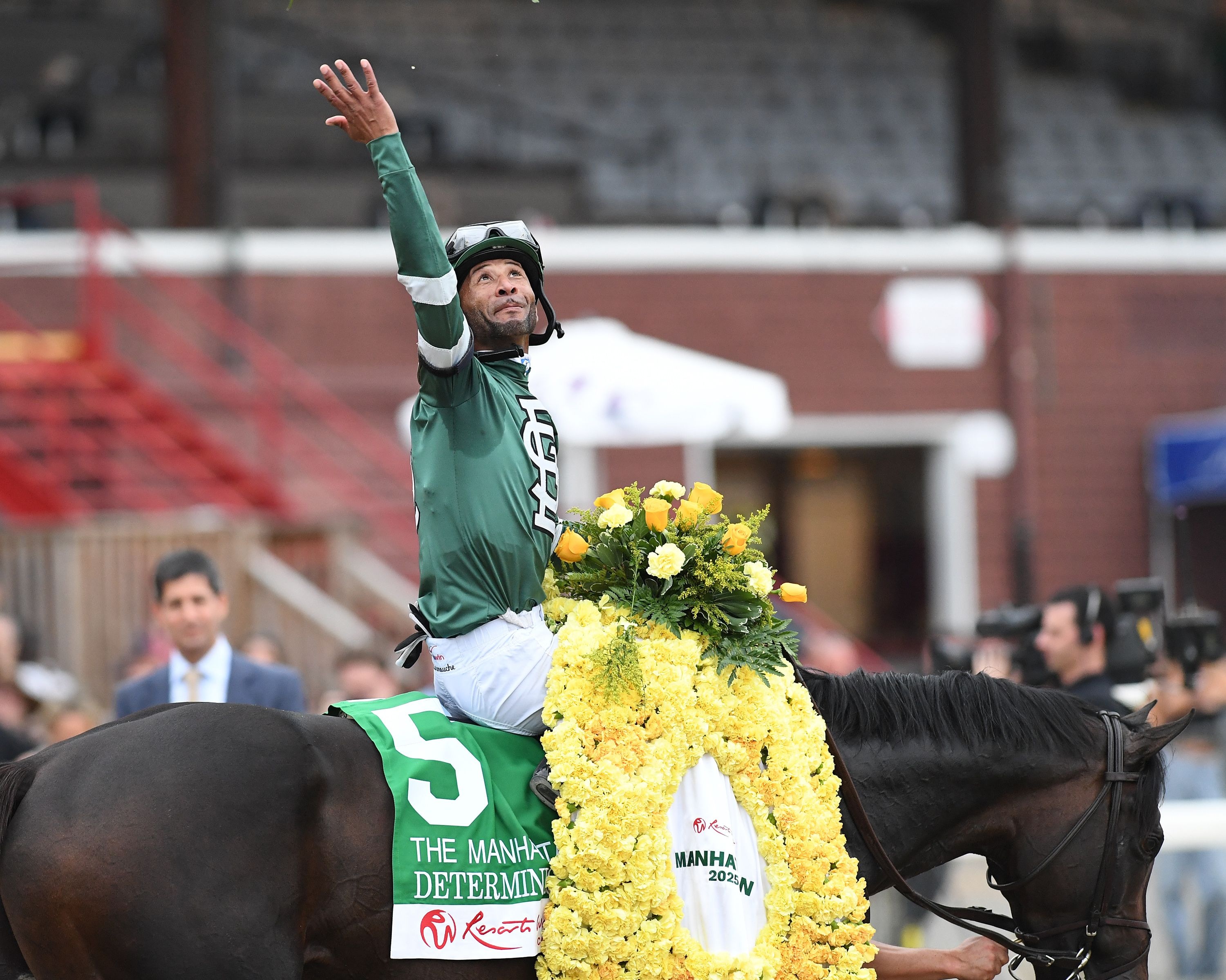 Jockey Kendrick Carmouche looks skyward aboard Deterministic after an emotional Manhattan (Photo by Dom Napolitano/Coglianese Photos)