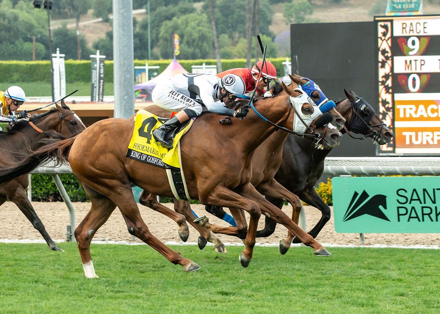 King of Gosford, an even second in his course-and-distance prep in the April 20 American (G3), moved forward to score a new career high in the Shoemaker. A more suitable race shape, combined with a tactical adjustment by Flavien Prat, proved decisive. With a stronger tempo on tap, the British-bred was allowed to relax further back early and pack a stronger punch late.