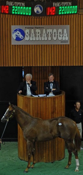 Barry Irwin of Team Valor made the winning bid of $2.2 million for the sales topper in Tuesday's second and final session of the Fasig-Tipton Selected Yearlings Sale at the Humphrey S. Finney Pavilion in Saratoga Springs, New York, purchasing a colt by Mr. Greeley out of the King of Kings (Ire) mare Win My Heart, who is a half-sister to Grade 3 victress Secret Liaison (Housebuster). From the same family of champion Sacahuista (Raja Baba) and Grade 1 winners Geri (Theatrical [Ire]) and Raging Fever (Storm Cat), the well-built chestnut is the first foal from his six-year-old dam. The Kentucky-bred youngster was offered as Hip No. 142 by Gainesway, agent. Lukas Enterprises purchased the session's second-highest seller, and the sale's leading filly, for $875,000 from the Eaton Sales, agent, consignment. Catalogued as Hip 160, the daughter of multiple leading sire Storm Cat is out of Blissful (Mr. Prospector), who is a full sister to 2000 Kentucky Derby (G1) winner Fusaichi Pegasus. The chestnut's granddam, Rowdy Angel (Halo), is responsible for classic winner and $2.2 million earner Pine Bluff (Danzig) and Grade 1 hero Demons Begone (Elocutionist).